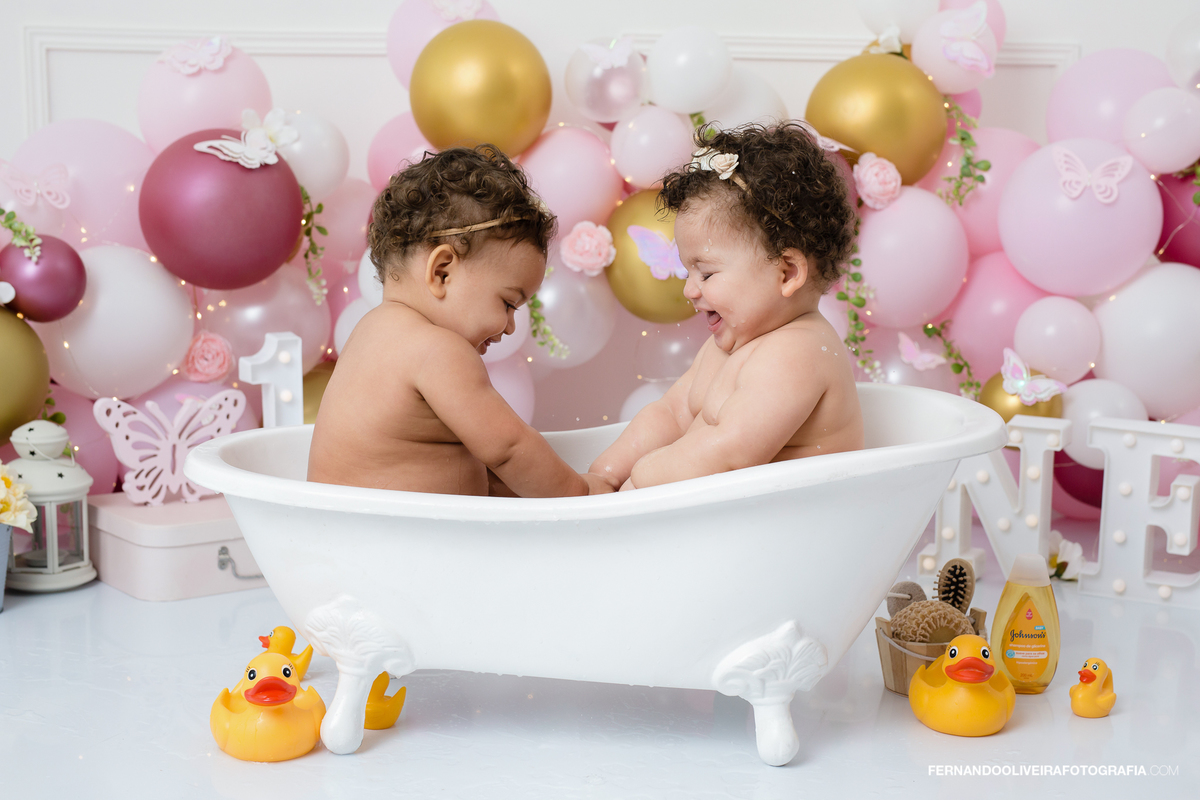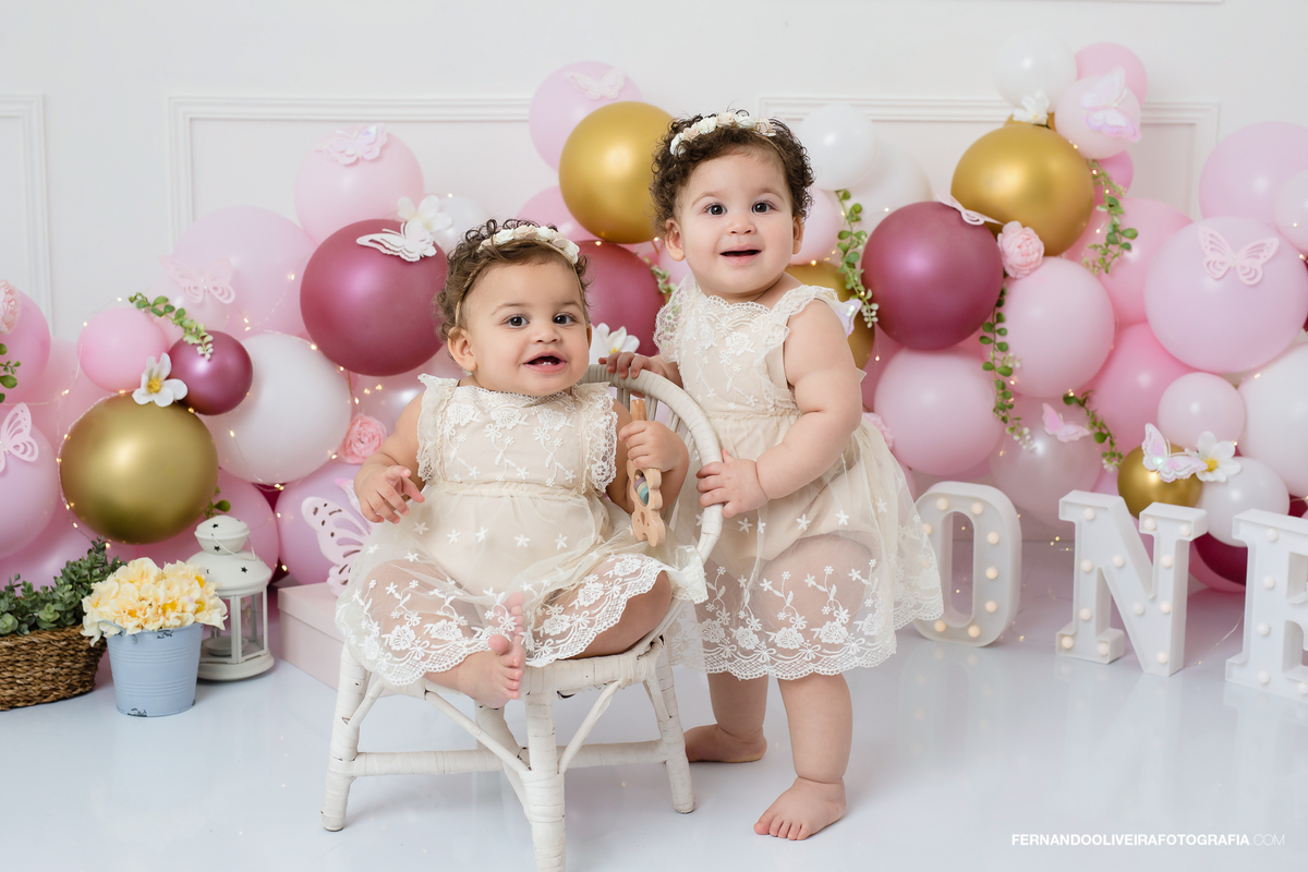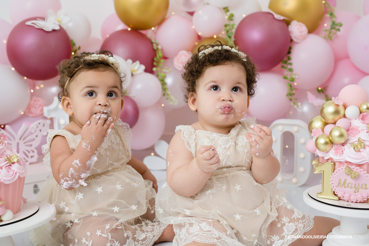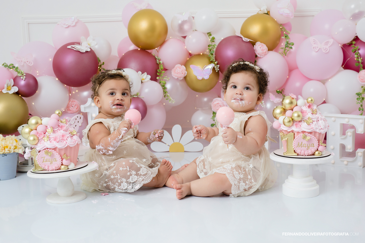 Ensaio smash the cake gemeas baloes Decoração estúdio São Paulo