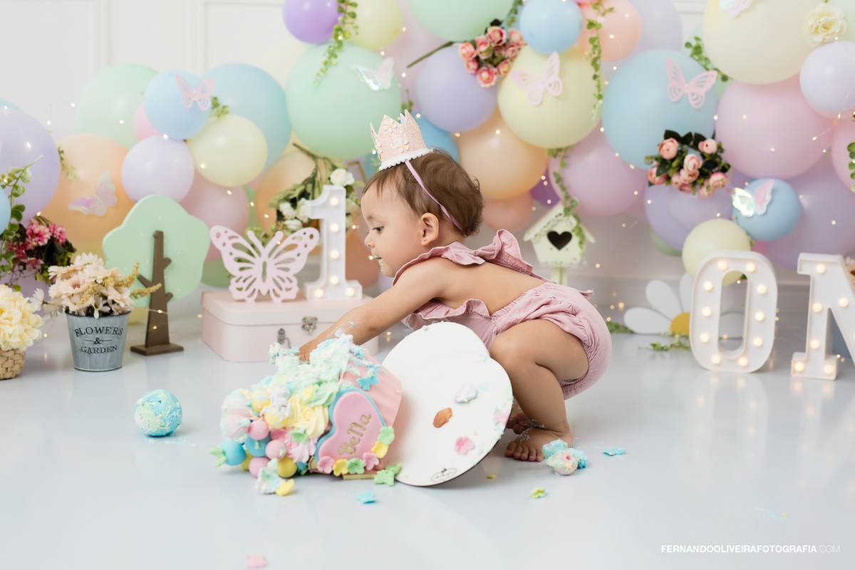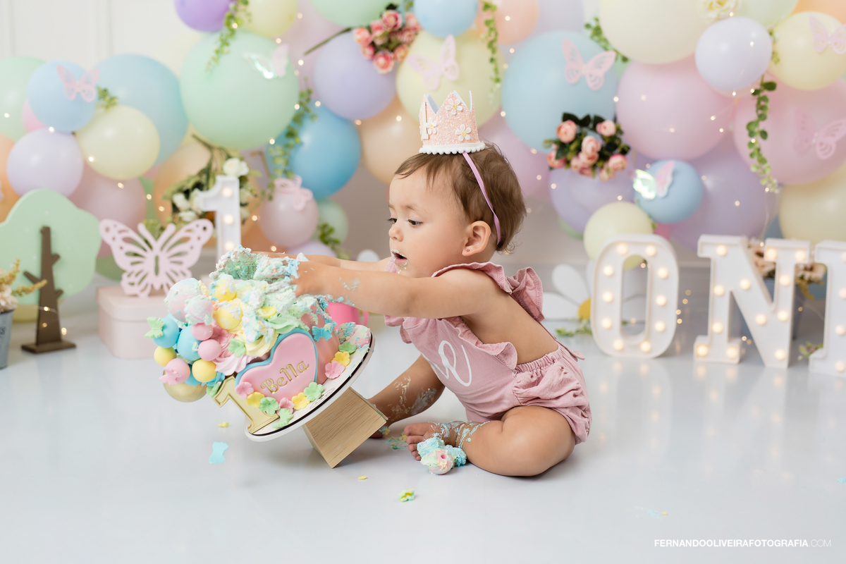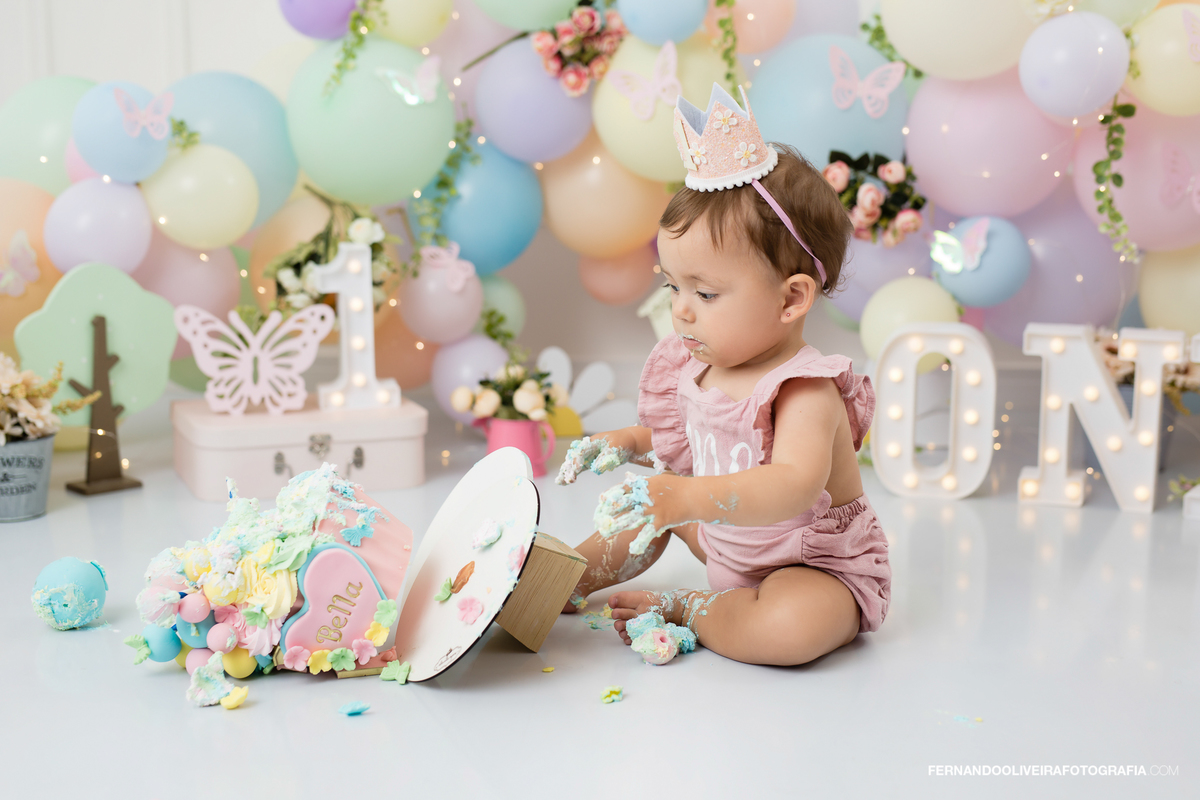 Celebre o primeiro aninho da sua princesa com um ensaio Smash the Cake inesquecível! Neste ensaio encantador da pequena Bella, capturamos toda a magia e diversão do momento em que ela experimentou o bolo pela primeira vez. Com decoração delicada em tons pastel, borboletas, flores, balões macios e luzes encantadoras, o cenário trouxe leveza e ternura para registrar sorrisos, lambuzadas e expressões puras de alegria.