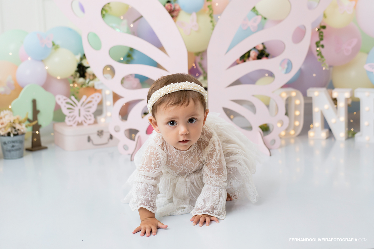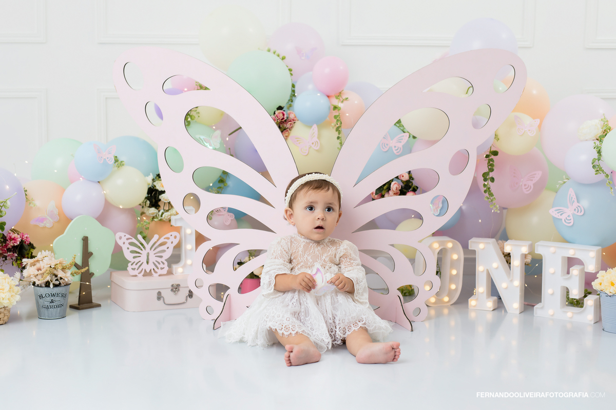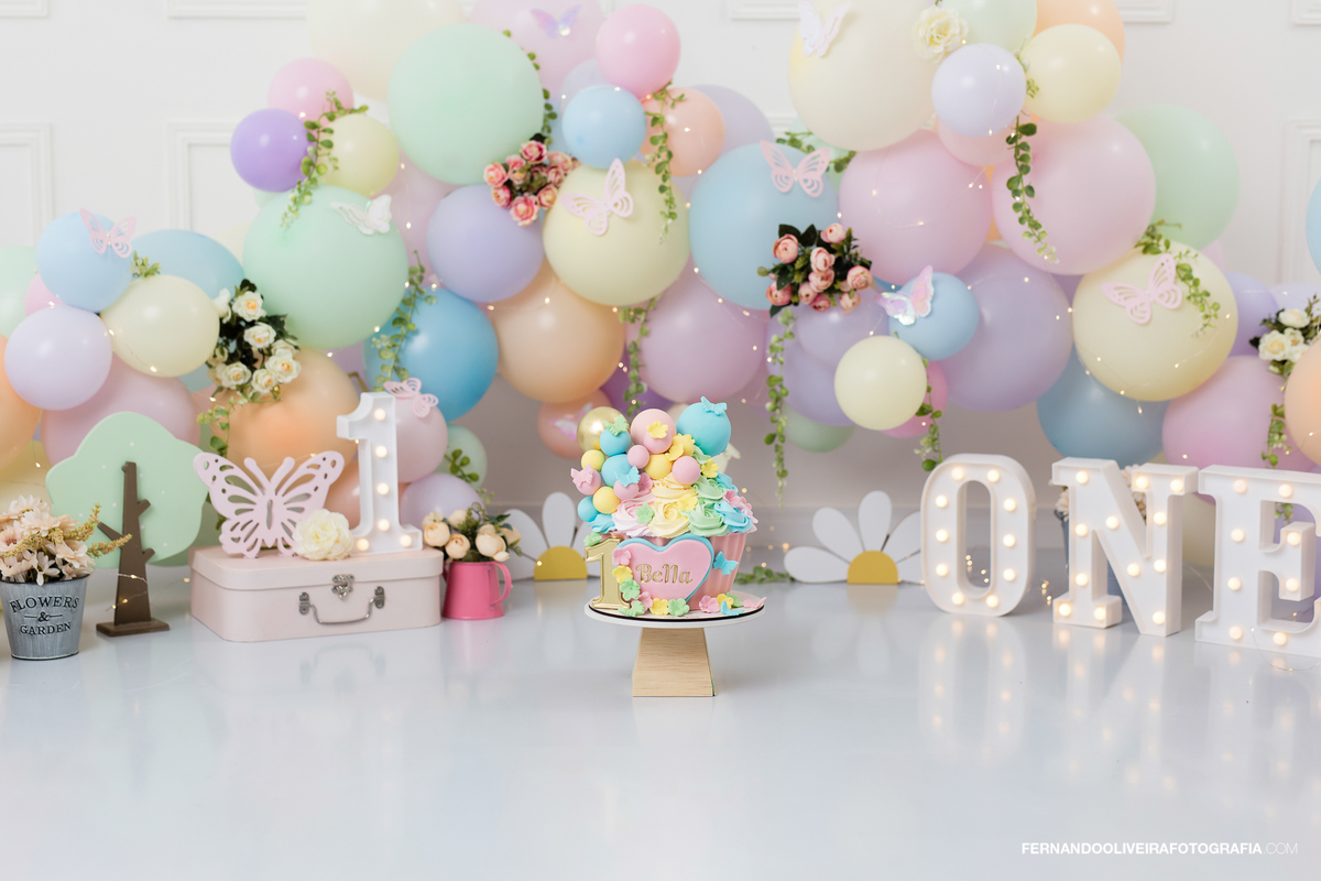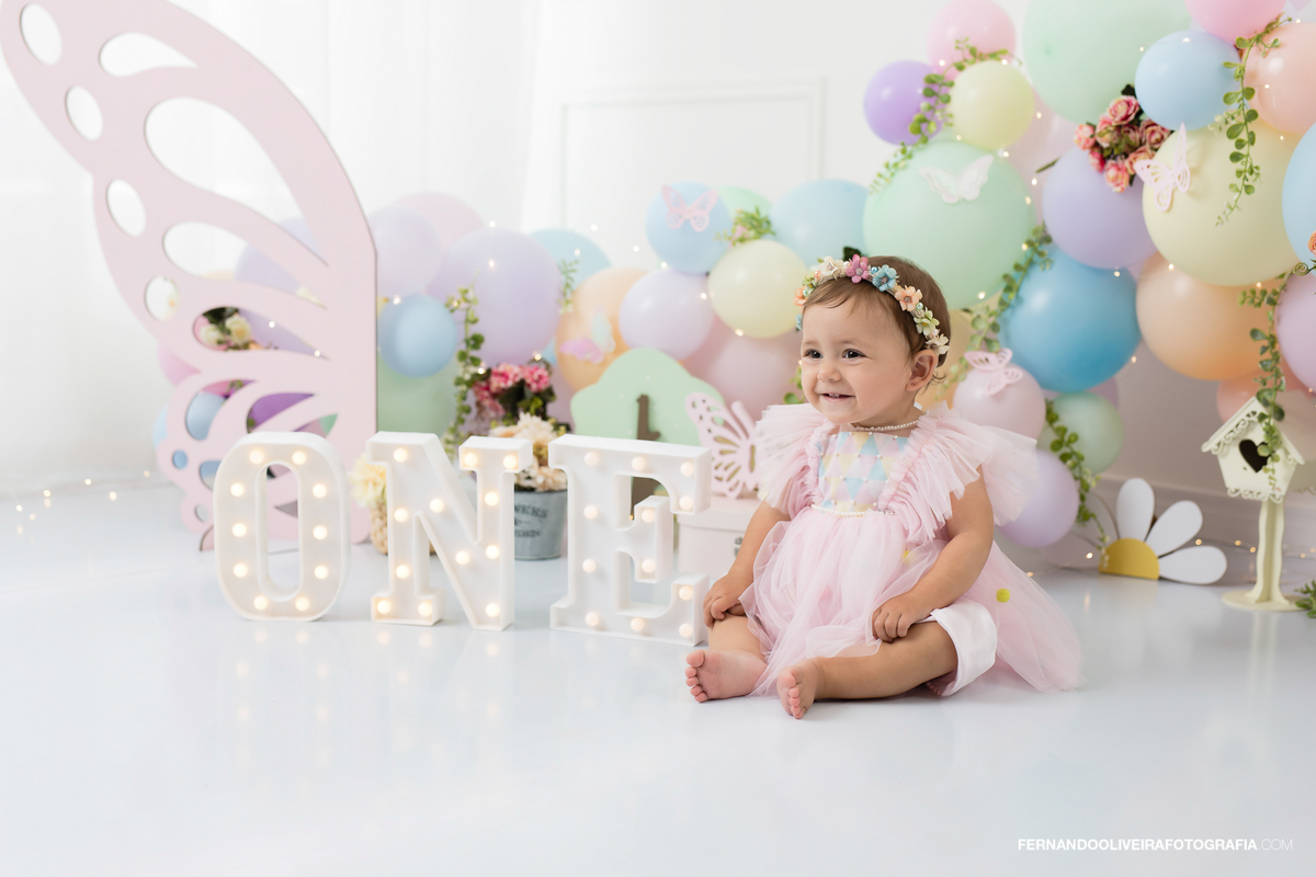 Celebre o primeiro aninho da sua princesa com um ensaio Smash the Cake inesquecível! Neste ensaio encantador da pequena Bella, capturamos toda a magia e diversão do momento em que ela experimentou o bolo pela primeira vez. Com decoração delicada em tons pastel, borboletas, flores, balões macios e luzes encantadoras, o cenário trouxe leveza e ternura para registrar sorrisos, lambuzadas e expressões puras de alegria.