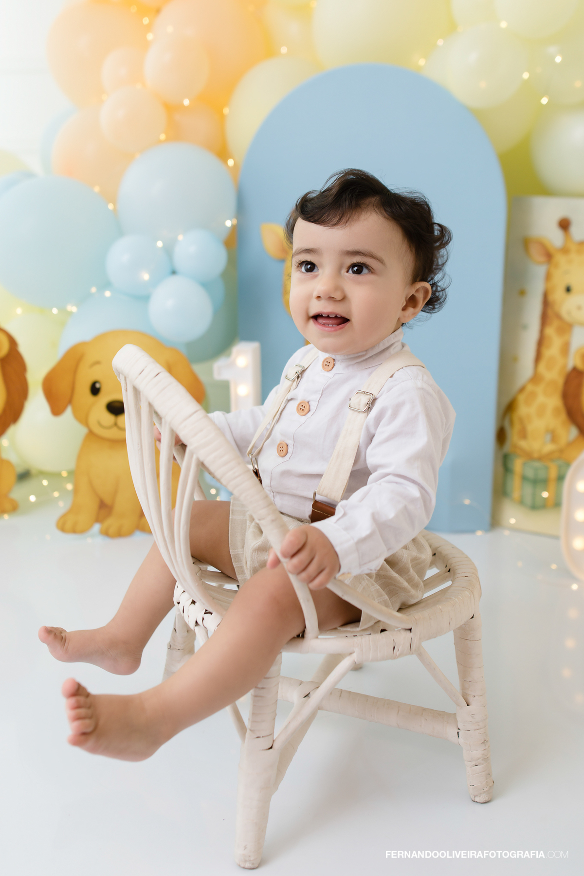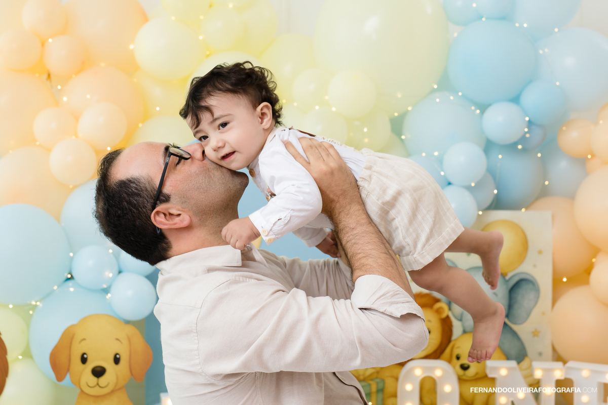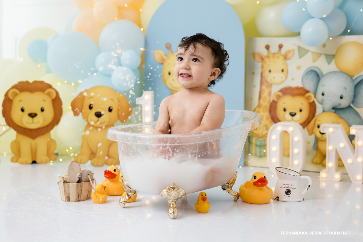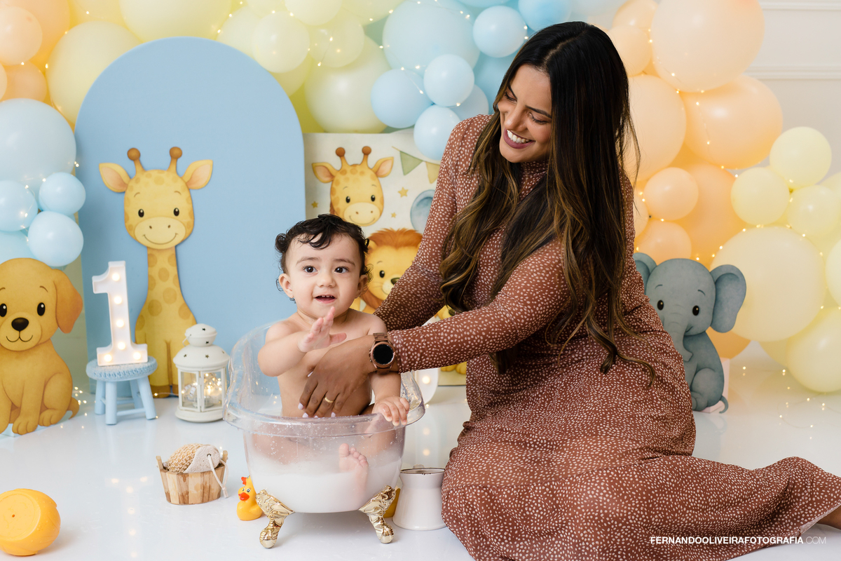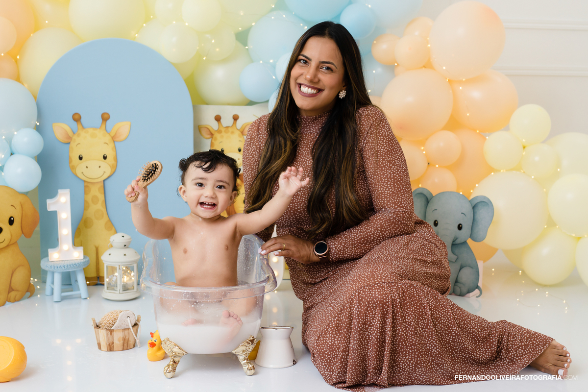 Cenário encantador com tema safari suave, balões tons pastel, bolo delicioso e muita bagunça gostosa de bebê. Registramos cada carinha de surpresa, sorrisos e lambuzada com carinho e naturalidade.