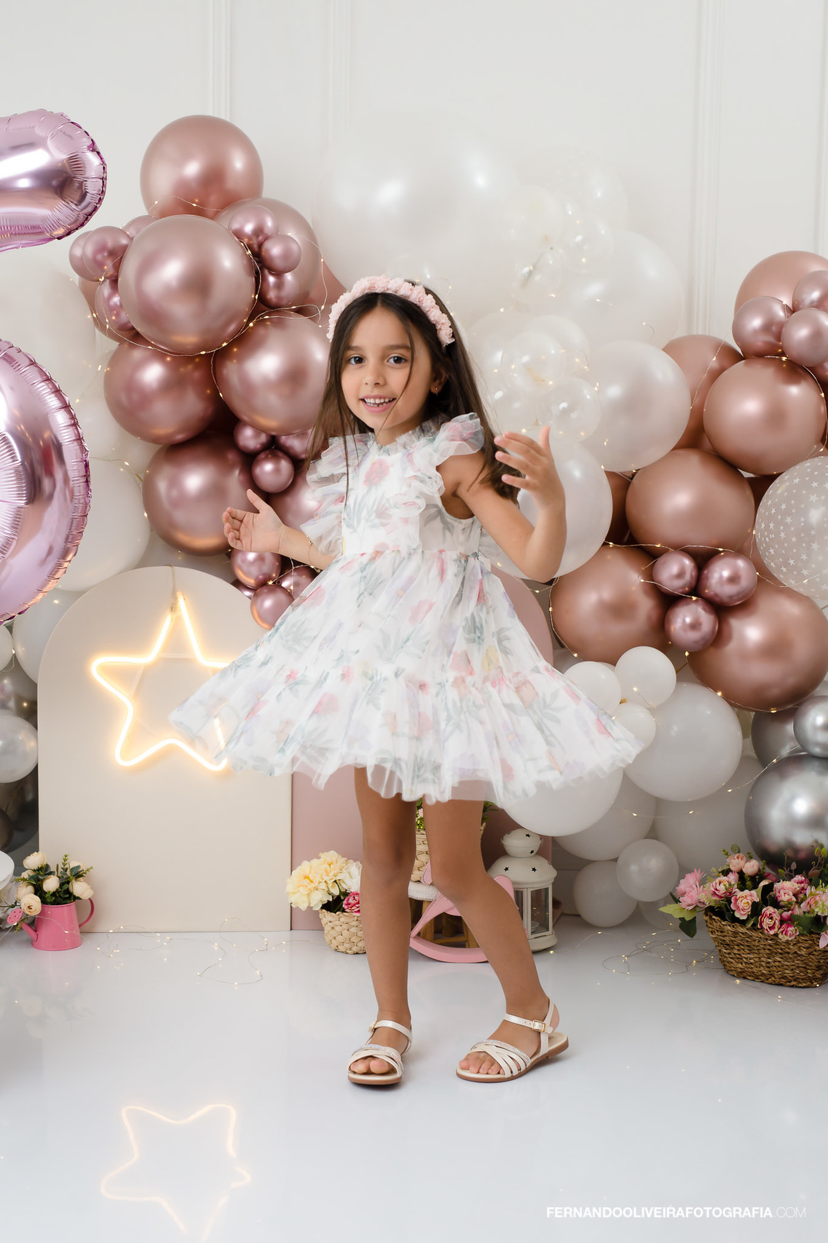 Esse ensaio de aniversário infantil em estúdio é perfeito para meninas que amam tons pastéis, rosa e dourado. Ideal para registrar a transição dos 5 para os 6 anos com emoção e beleza atemporal.