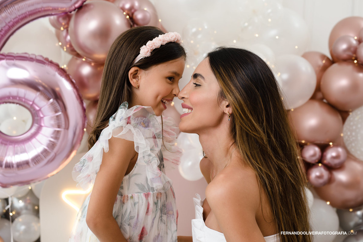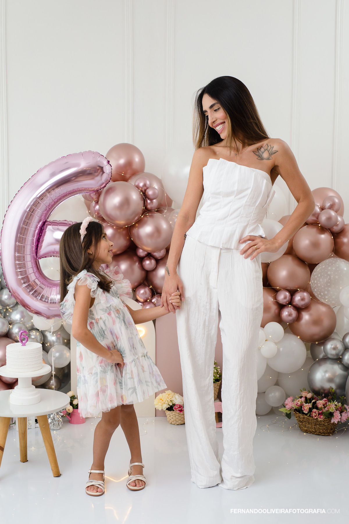 Há exatos 5 anos registramos o primeiro aninho dela, e agora voltamos a eternizar esse momento mágico de crescimento. A pequena Luiza brilhou em um cenário delicado e sofisticado com tons de rose gold, balões metálicos rosa e prateados, bolo minimalista, arco de balões, estrelas iluminadas, cavalinho de pau rosa e muitos detalhes fofos que combinam perfeitamente com sua personalidade doce e radiante.